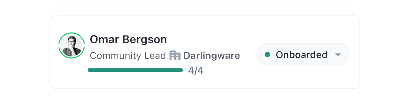 Keep members and teammates in sync. Every contributor gets an onboarding checklist. While you and your team get a shared view of their progress.