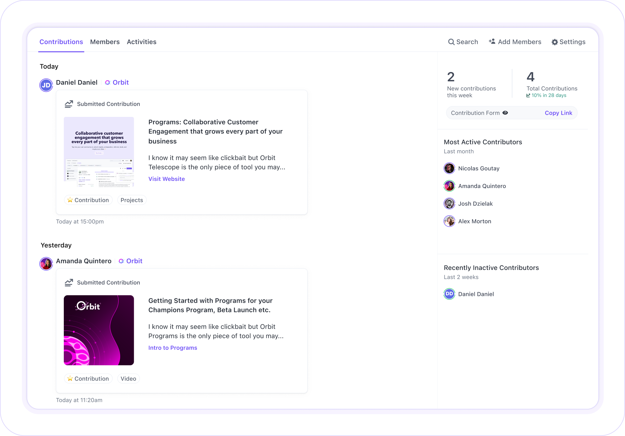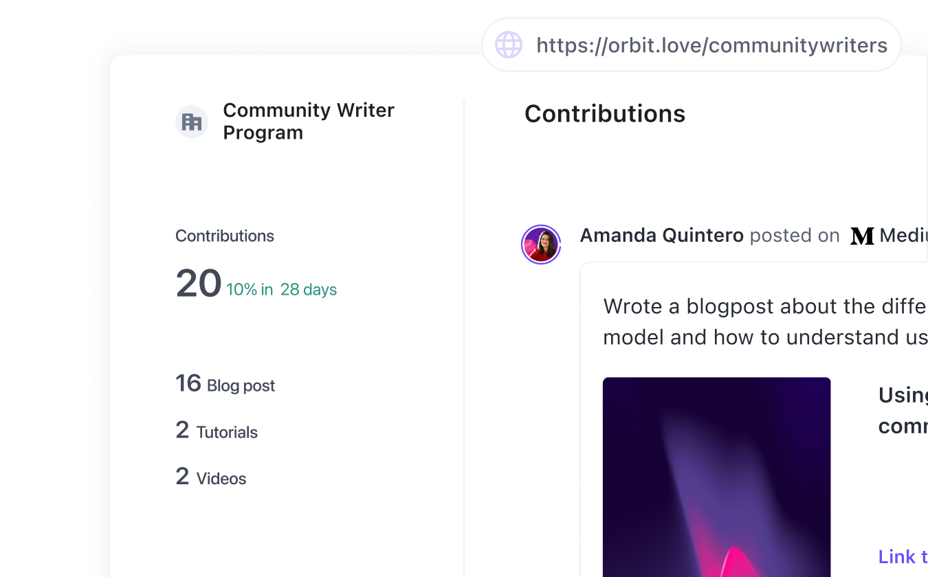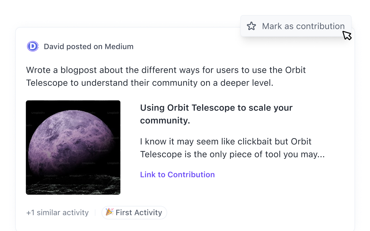 Mark any activity in Orbit as a contribution. Capture it on your dedicated program page.
